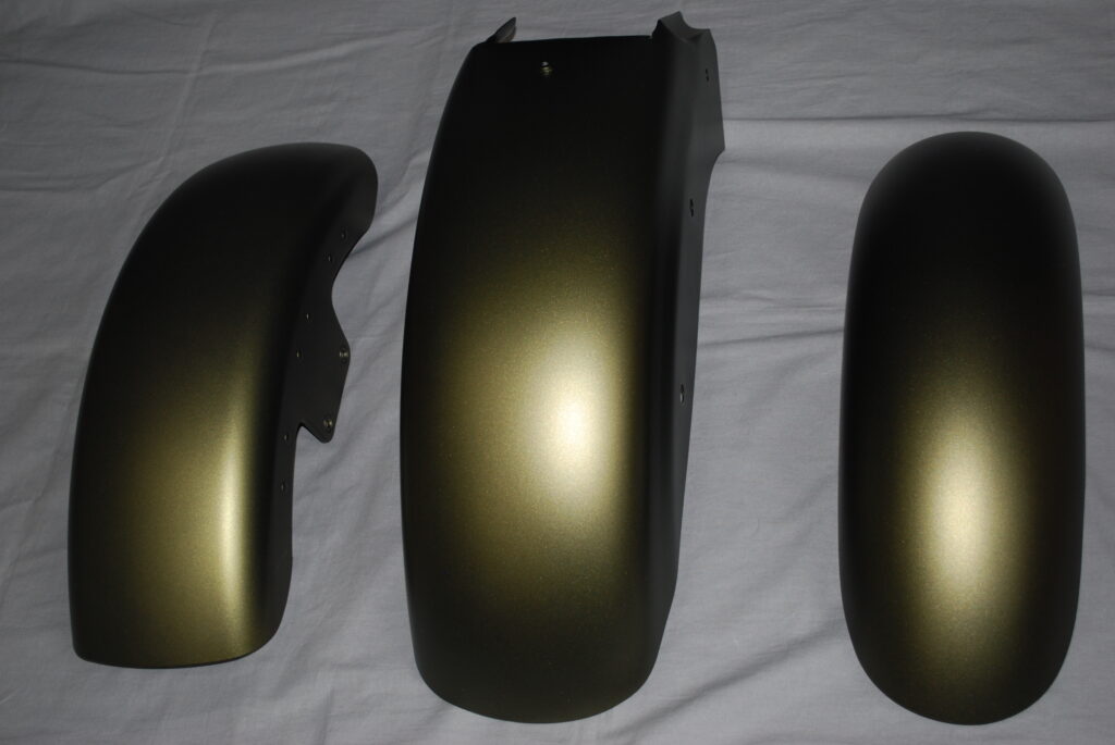 社外品のフロントフェンダーとリヤフェンダーを、ハーレー純正色「オリーブゴールドデニム」でペイントしました。