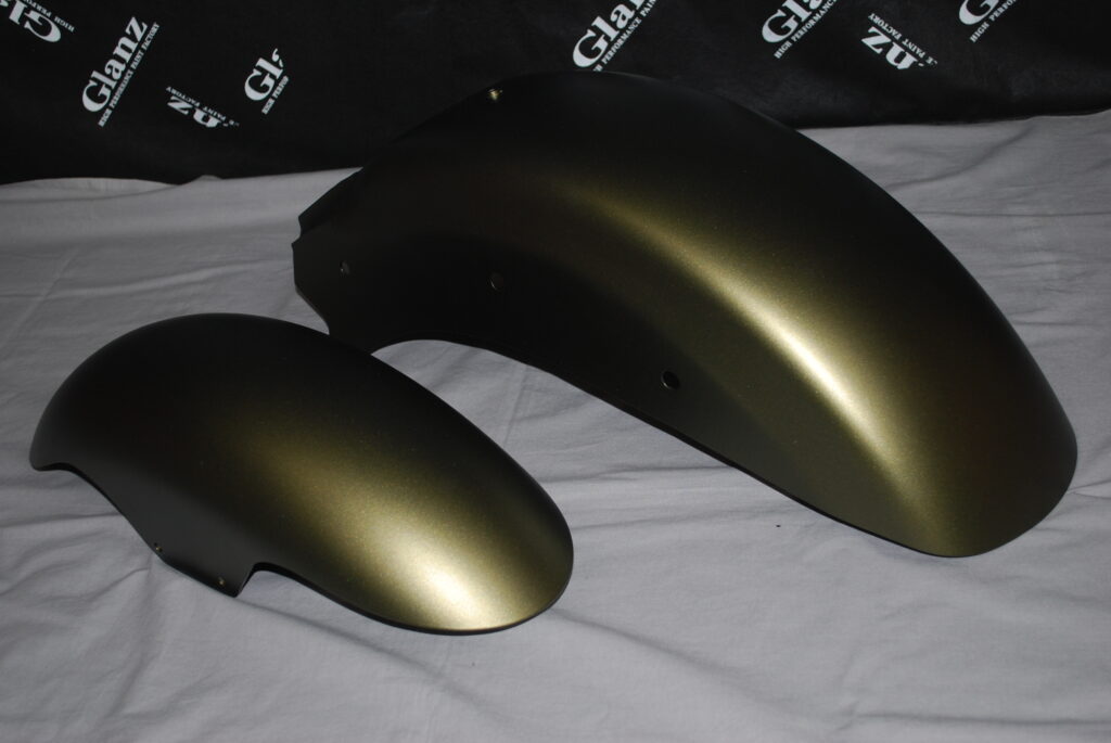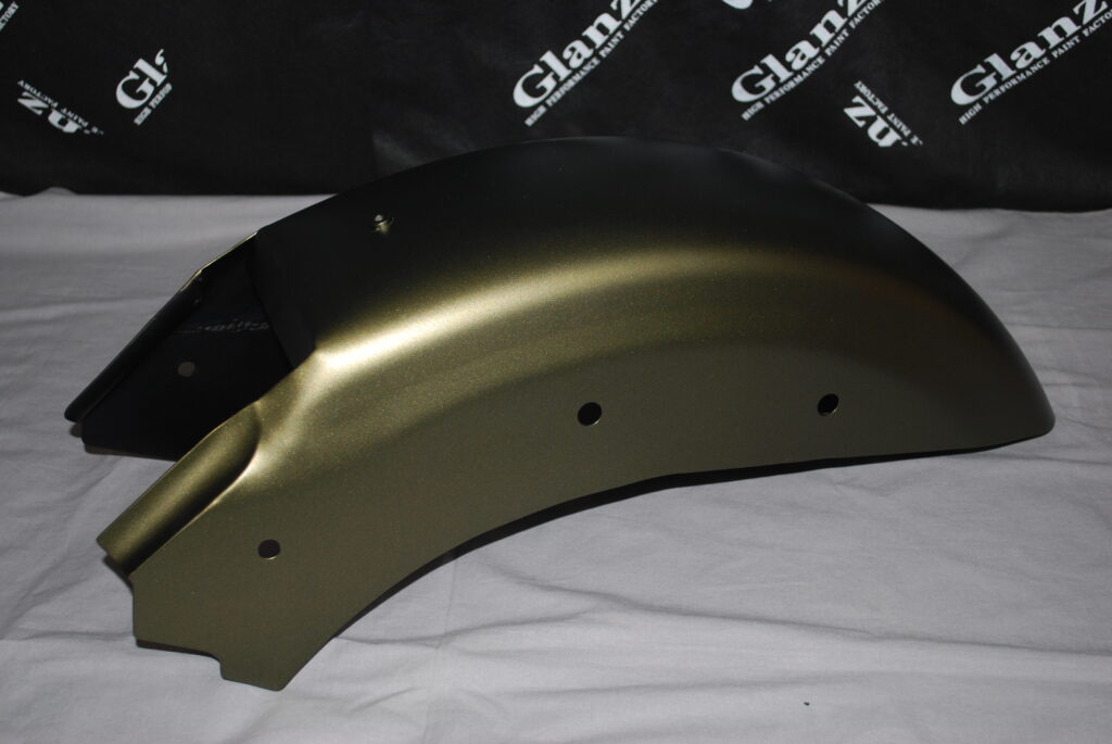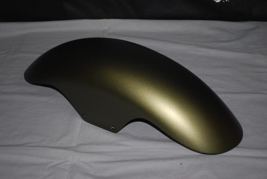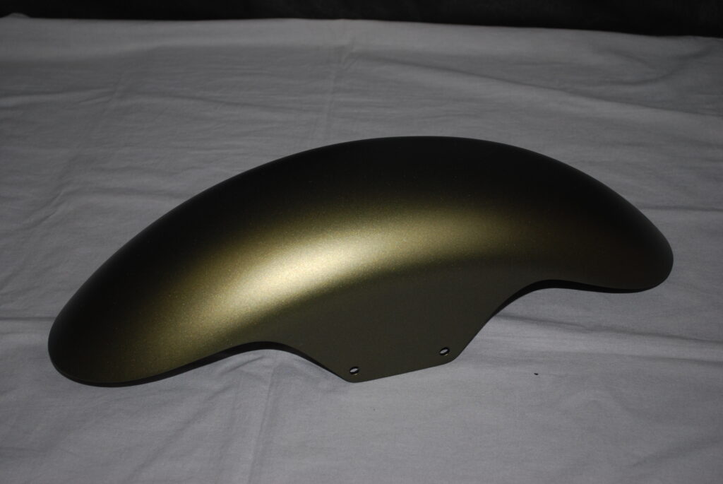 社外品のフロントフェンダーとリヤフェンダーを、ハーレー純正色「オリーブゴールドデニム」でペイントしました。