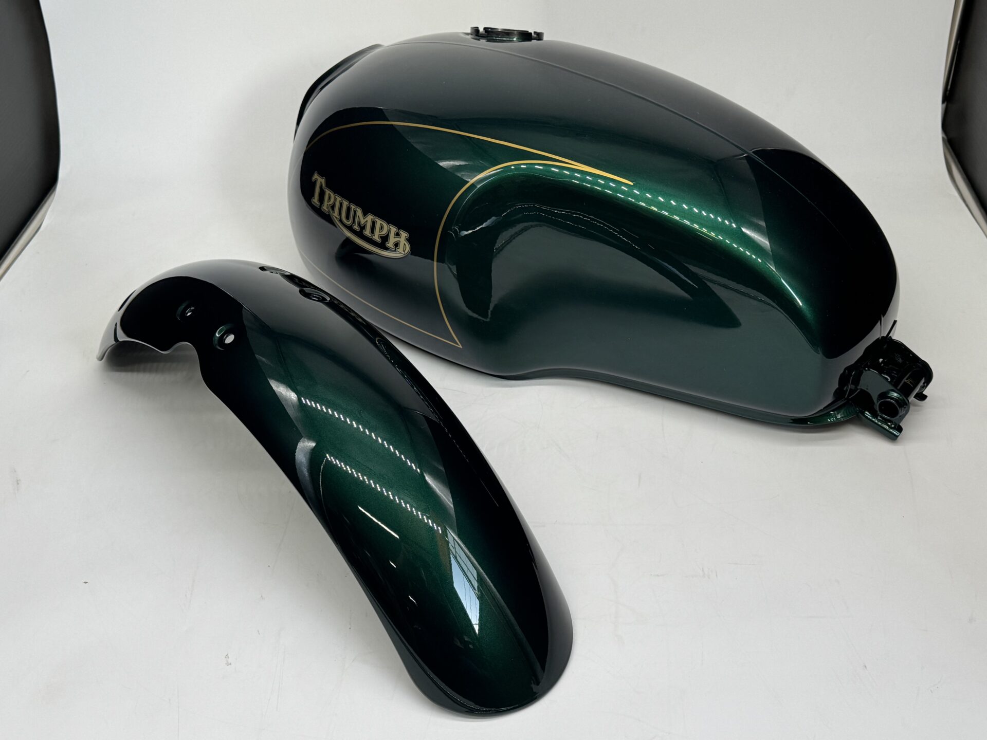 フロントフェンダーを純正色「コンペティショングリーン」でペイントしました。