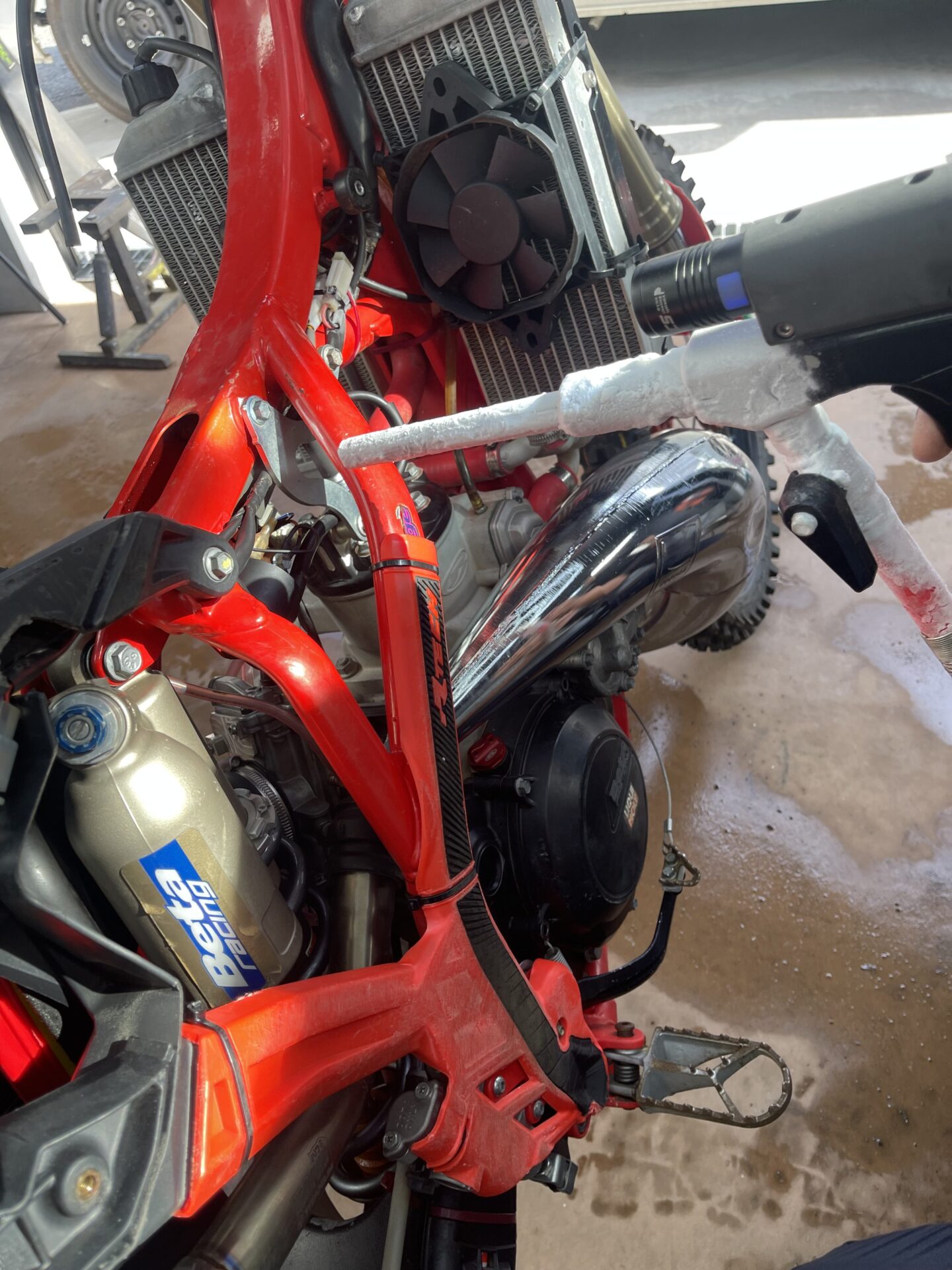 このドライアイスクリーニングについてを簡単に説明させていただくと、冒頭のとおり、ドライアイスを吹き付け、その熱膨張の変化によって付着した『汚れ』自体を気化させ、蒸発させるという画期的なもので、まさに新時代の洗浄方法といえるシステム。それを難しく解説すると「マイナス79度で高速噴射されたドライアイスがバイクやクルマなどの表面についた付着物(汚れ)を瞬間冷却することに対して、常温を保とうとする洗浄物の母材との温度差により、付着物に熱収縮が起こり、それによって汚れの表面がもろくなり、その隙間にドライアイスが次々に入り込み、瞬間で個体から気体へと変化することを利用した洗浄方法」なのですが、アルミナを吹き付けるサンドブラストや薬品による化学変化で汚れを落とす洗浄剤などと異なり、あくまでもクリーン。施工対象物を傷つけにくく、付着物が一切残らず、汚れを気化させ、蒸発させるものとなっています。