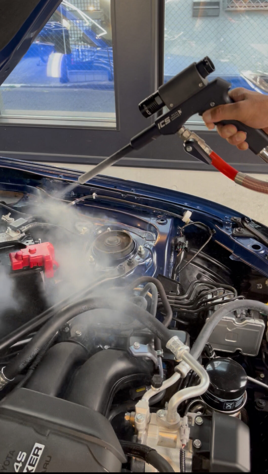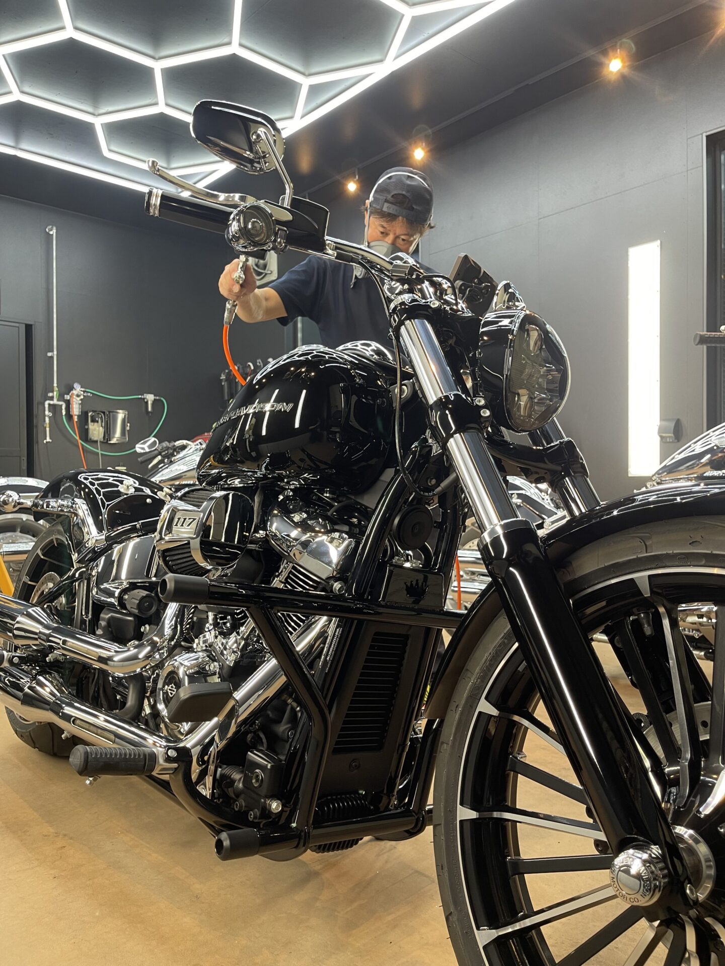 当社グランツでは最近、ペイント業務と並んでカー&バイクの『ディテーリング』に力を入れているのですが、またまたコレを簡単に説明させていただくと「バイクやクルマの世界で細部に渡る清掃や磨き、保護を専門的に行う作業」のことで、プロならではの技術を駆使した洗車やコーティング施工とでもいえばいいでしょうか。ブラシの入らないバイクのエンジンフィンやクルマのエンジンルームの細部、ホイールなどをドライアイスクリーニングで徹底洗浄することに加えて、水道水に含まれるミネラルやカルキ、不純物を取り除いた「純水」による洗車を合せ技で行い、お客様の愛車を美しく仕上げさせていただいています。