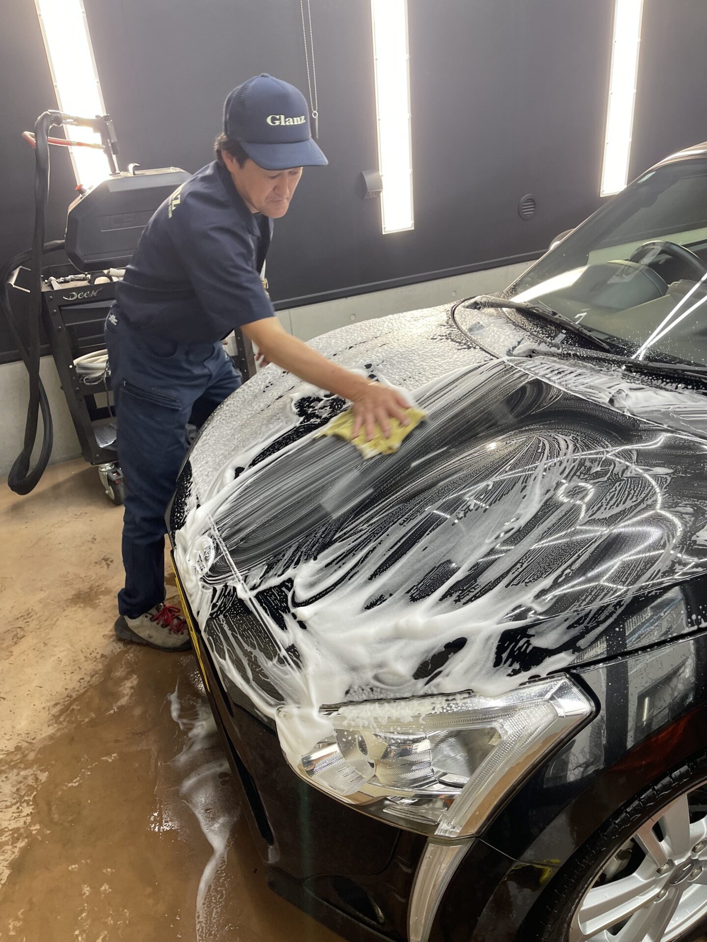 当社グランツでは最近、ペイント業務と並んでカー&バイクの『ディテーリング』に力を入れているのですが、またまたコレを簡単に説明させていただくと「バイクやクルマの世界で細部に渡る清掃や磨き、保護を専門的に行う作業」のことで、プロならではの技術を駆使した洗車やコーティング施工とでもいえばいいでしょうか。ブラシの入らないバイクのエンジンフィンやクルマのエンジンルームの細部、ホイールなどをドライアイスクリーニングで徹底洗浄することに加えて、水道水に含まれるミネラルやカルキ、不純物を取り除いた「純水」による洗車を合せ技で行い、お客様の愛車を美しく仕上げさせていただいています。
